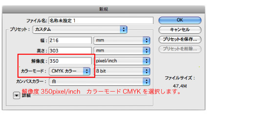 データのカラーモードは必ずCMYKで指定してください。RGBデータで作成されますと色味がかなり変わります。 イラストレータの場合、ファイル→ドキュメントのカラーモードがCMYKになっているか確認 フォトショップの場合、イメージ→モードがCMYKになっているか確認して下さい。