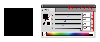 スミベタK100%とリッチブラックC50%M40%Y30%K100%はモニターの見た目ではどちらも黒に見えますが、リッチブラックはK以外の色も指定してありますのでカラー扱いとなります。